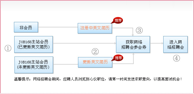 想沾点“JOB168英文站”的喜气儿, 快来注册成为我们的会员吧! 网络招聘会期间登陆English.job168.com注册简历, 将可获得价值120元英文站主页自荐服务。