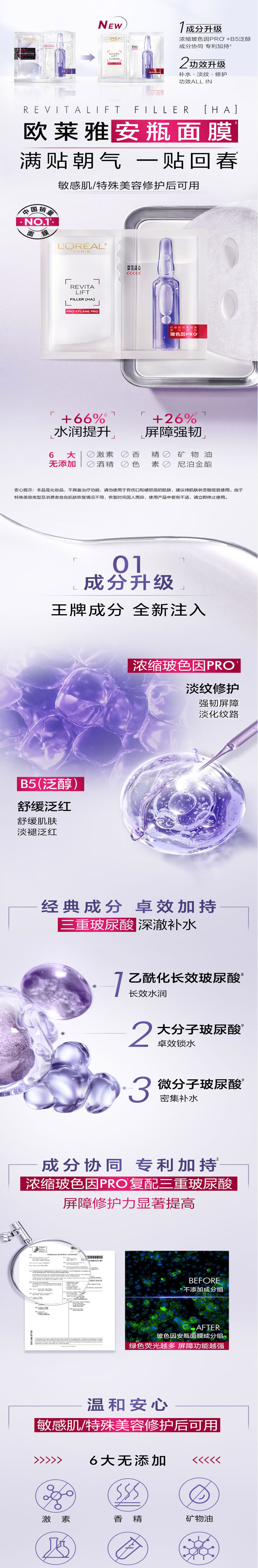 欧莱雅复颜玻尿酸水光充盈导入安瓶鲜注玻色因面膜 33g*5片