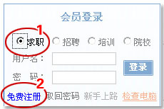 1.网站首页及各分站左上角“会员登录”框,先选择“求职”,再点击“免费注册”。