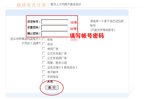 2.进入帐号注册页面,按要求填写帐号、密码,然后点击“提交”。