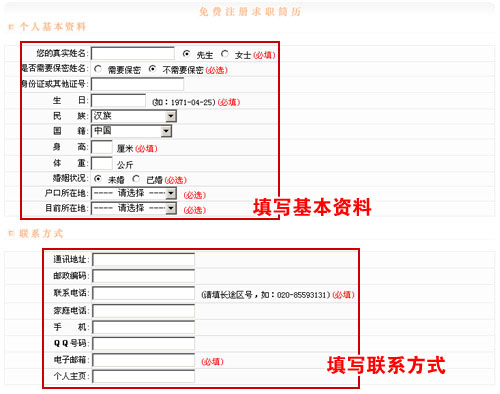 3.进入个人资料填写页面,建议个人求职用户详细填写个人的资料和具体联系方式,然后点击“注册”。