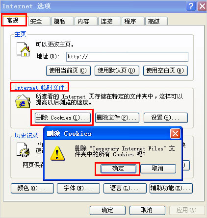 2、在“常规”标签页,点击“Internet临时文件”区域的“删除Cookies”,在弹出的“删除Cookies”框中点击“确定”。