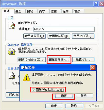 3、点击“Internet临时文件”区域的“删除文件”,在弹出的“删除文件”框中勾选“删除所有脱机内容”,然后点击“确定”。