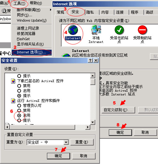 4、在“安全”标签页,选择“Internet”图标,然后点击“自定义级别”,在弹出的“安全设置”框中找到“运行ActiveX控件和插件”,选择“启用”然后按“确定”关闭“安全设置”框。