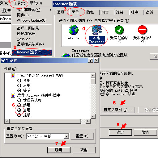 5、在“安全”标签页,选择“本地Intranet”图标,然后点击“自定义级别”,在弹出的“安全设置”框中找到“运行ActiveX控件和插件”,选择“启用”然后按“确定”关闭“安全设置”框。